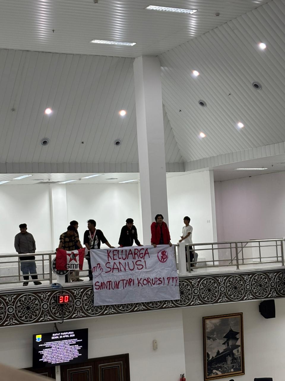 CIANJUR – Sejumlah mahasiswa nekat membentangkan spanduk bertuliskan ‘Keluarga Sanusi (Santun tapi Korupsi)’ saat rapat paripurna DPRD dengan agenda pembahasan usulan Rancangan Peraturan Daerah (Raperda) di Gedung DPRD Kabupaten Cianjur, Senin malam, 20 April 2026. Aksi itu ditengarai merupakan bentuk pelampiasan kekecewaan terhadap pemerintah daerah yang tak pernah hadir pada audiensi dengan mereka.