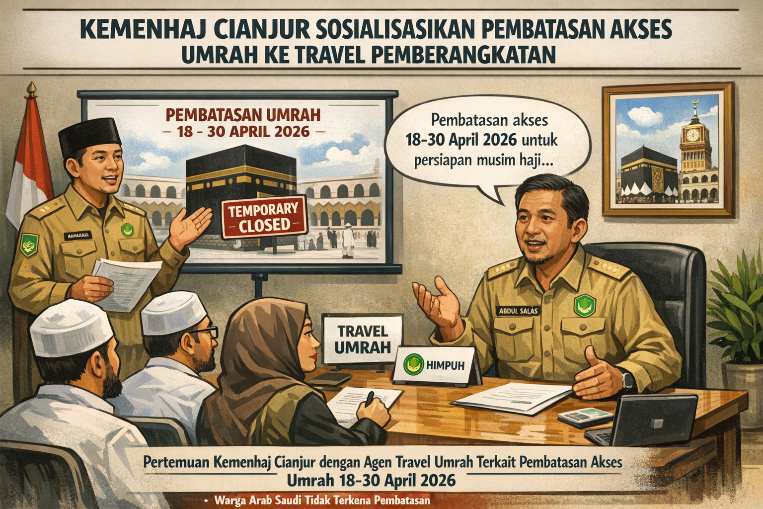 Di lingkup Kantor Kementerian Haji dan Umrah (Kemenhaj) Kabupaten Cianjur, kebijakan tersebut sudah disosialisasikan. Pada 18-30 April, kebijakan pembatasan akses ibadah umrah mulai diberlakukan.
