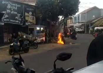 Cianjur - Sebuah motor jenis Kawasaki Ninja ZX 250 terbakar di sekitar Patung Silat di Desa Kademangan, Kecamatan Mande, Senin,(29/01/24)....