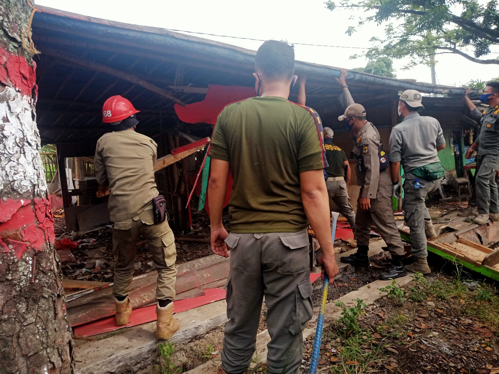 PENERTIBAN: Personel gabungan menertibkan puluhan bangunan kios yang terbengkalai di sepanjang Jalan Raya Bandung. (Dok.Istimewa)