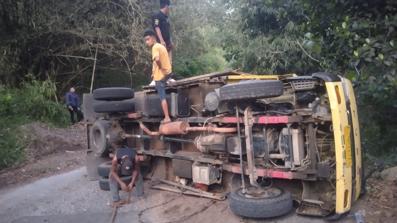 Namun tiba-tiba truk mundur. Setelah itu terguling.