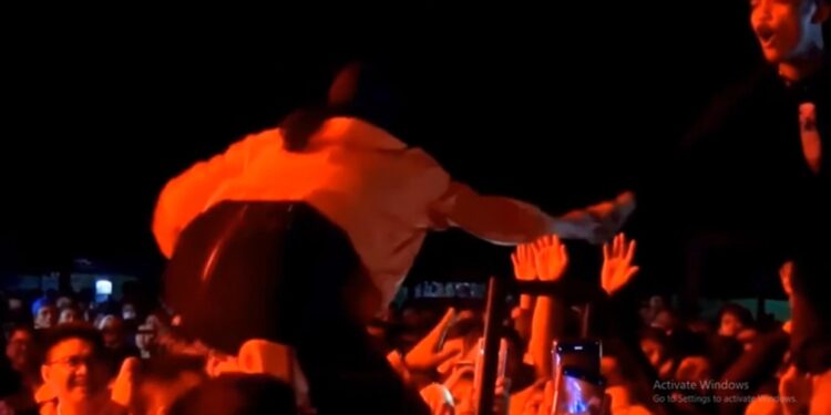 CIANJUR – Vokalis band Kotak, Tantri Syalindri Ichlasari terjatuh dari atas panggung di pembukaan Pekan Olahraga Kabupaten (Porkab) VII 2024 Cianjur, Sabtu malam, (13/07/2024).