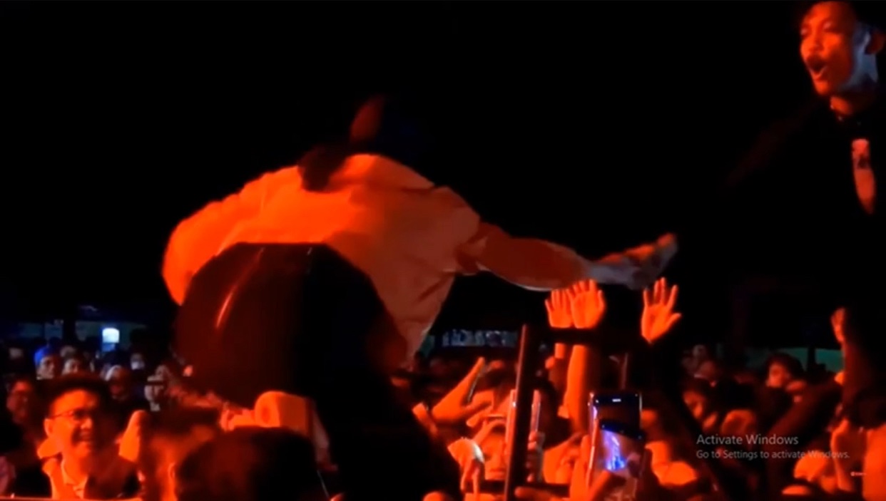 Lady Rockers Indonesia itu jatuh lantaran ditarik oleh penonton saat sedang menyapa mengulurkan tangannya setelah menyelesaikan semua lagu-lagunya.