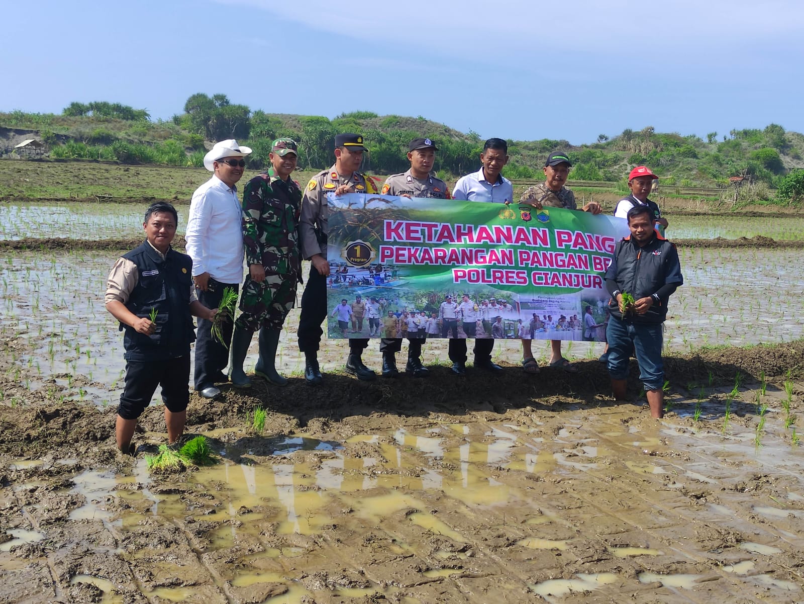 Kegiatan dipimpin langsung Kapolsek Cidaun Iptu Yudi Heryanadi. Bersama unsur Forkopimcam, Yudi turun langsung ke lahan sawah untuk menanam padi.