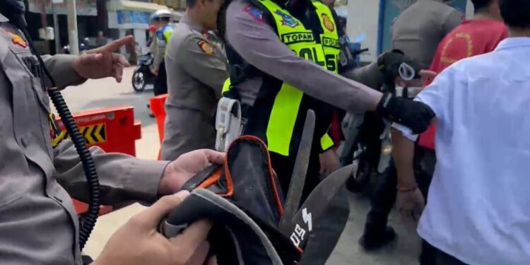 CIANJUR – Enam pelajar SMK Sukabumi diamankan polisi usai terjaring razia di Jalan Raya Cianjur-Sukabumi, Warungkondang, Kabupaten Cianjur, Rabu (24/7/2024). Dua di antaranya kedapatan membawa senjata tajam jenis golok.
