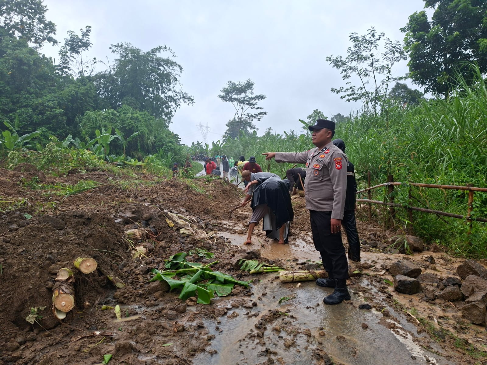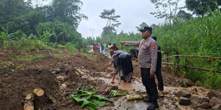 EVAKUASI: Jajaran Polsek Cikalongkulon bersama masyarakat membersihkan material tanah longsor yang menutup jalan. (Dok/Polsek Cikalongkulon)