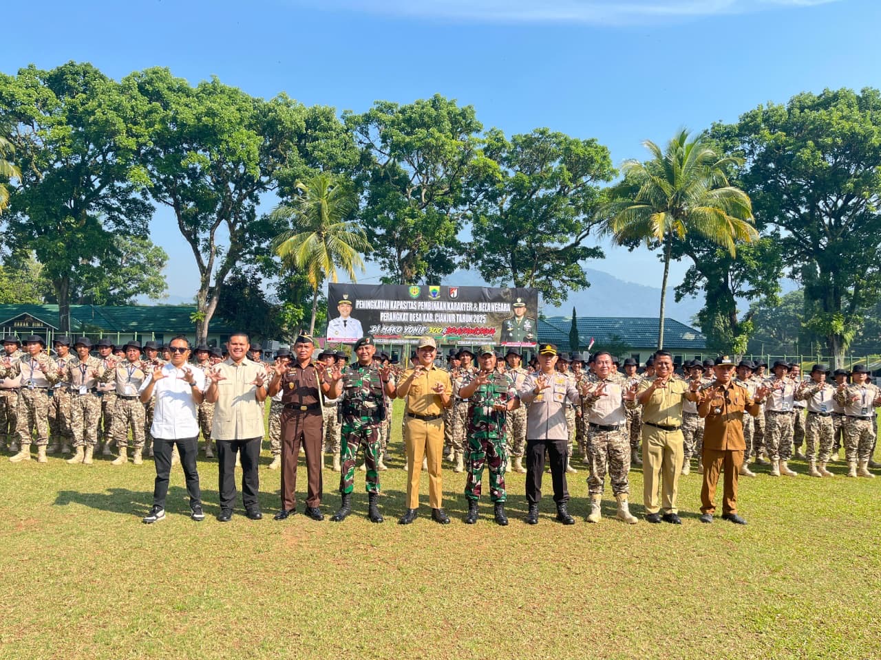 CIANJUR – Sebanyak 64 kepala desa berikut perangkat di Kabupaten Cianjur mengikuti kegiatan peningkatan kapasitas pembinaan karakter dan bela negara di Lapangan Braja Yonif 300/BJW, Senin, 6 Oktober 2025. Kegiatan dibuka Bupati Cianjur Mohammad Wahyu Ferdian didampingi Danyonif 300/BJW, Kapolres Cianjur, Dandim 0608/Cianjur, Kajari Cianjur, dan unsur Forkopimda.
