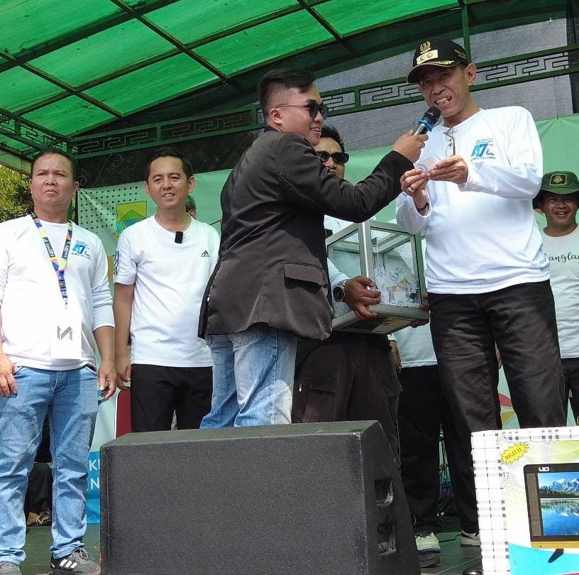 IKUT MERIAHKAN: Anggota DPRD Kabupaten Cianjur Lukmanul Hakim mendampingi Plt Bupati Cianjur Tb Mulyana Syahrudin saat mengundi pemenang jalan santai HUT ke-47 Desa Sindanglaya. (Dok. Istimewa)