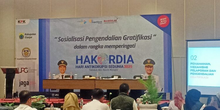 CIANJUR – Komisi Pemberantasan Korupsi (KPK) mengumpulkan aparatur sipil negara (ASN) di lingkup Pemkab Cianjur, Rabu, 19 November 2025. Usut punya usut, kegiatan tersebut merupakan agenda sosialisasi pengendalian gratifikasi yang dilaksanakan di salah satu hotel di bilangan Jalan Dewi Sartika (Sinar).