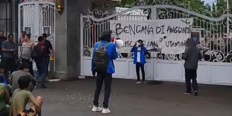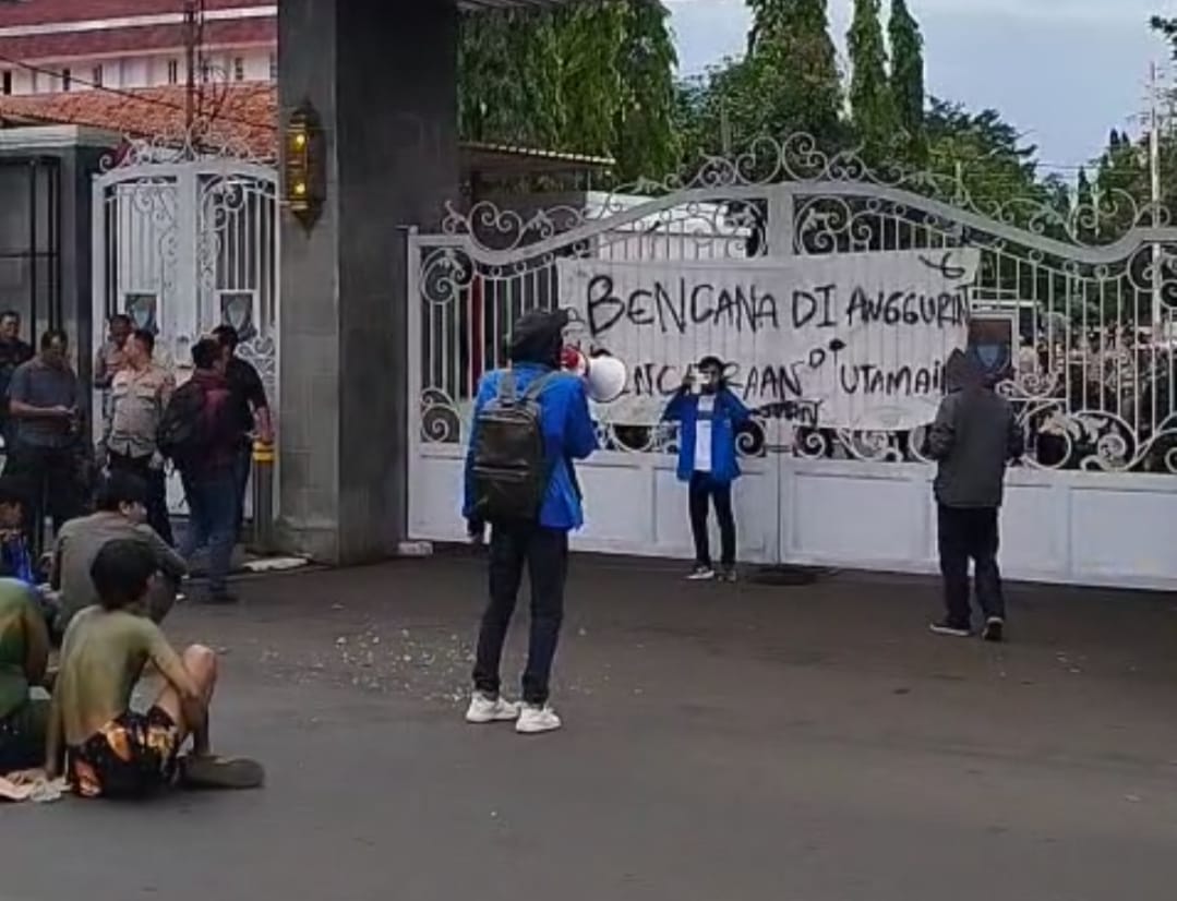 CIANJUR – Massa Pergerakan Mahasiswa Islam Indonesia (PMII) Kabupaten Cianjur bersama Aliansi Mahasiswa Rakyat (AMAR) berunjuk rasa di Pendopo Cianjur, Jumat, 24 Oktober 2025. Mereka menyuarakan aspirasi penyaluran dana tunggu hunian (DTH) bagi korban bencana pergeseran tanah di selatan Cianjur.