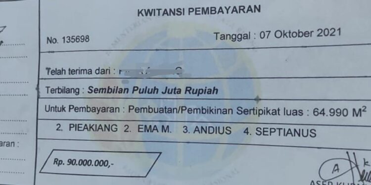 Dalam kwitansi itu tertera lambang Kementrian Agraria dan Tata Ruang / Badan Pertanahan Nasional (ATR/BPN), tertera untuk pembayaran pembuatan sertifikat tanah dengan luas 44.990 meter persegi untuk ke empat nama berinisial P, A, E dan S dengan nominal angka pembayaran sebesar Rp90 juta. Pada kwitansi itu pun tertera nama Kepala Desa C sebagai saksi.