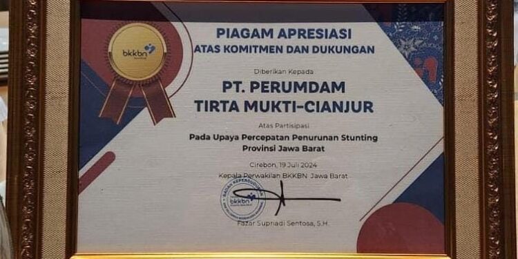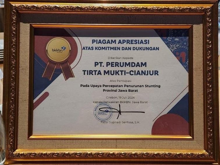 CIANJUR – Perumdam Tirta Mukti Cianjur menerima piagam apresiasi pengentasan stunting dalam acara malam anugerah bangga kencana Badan Kependudukan dan Keluarga Berencana Nasional (BKKBN) Provinsi Jawa Barat di Hotel Aston Cirebon, Jumat (19/7/2024).