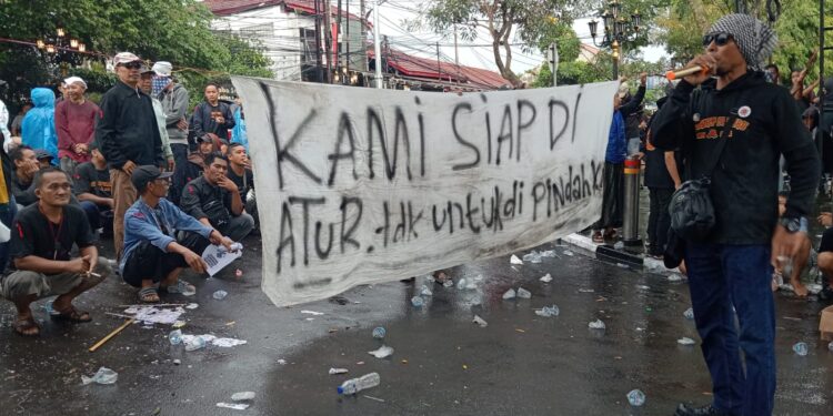 CIANJUR – Pedagang Pasar Bojongmeron bersama mahasiswa GMNI, PMII, dan Lembaga Bantuan Hukum (LBH) Cianjur berunjuk rasa ke komplek Pemkab Cianjur, Jumat, 7 November 2025. Mereka memprotes rencana relokasi para pedagang ke Pasar Induk Cianjur.
