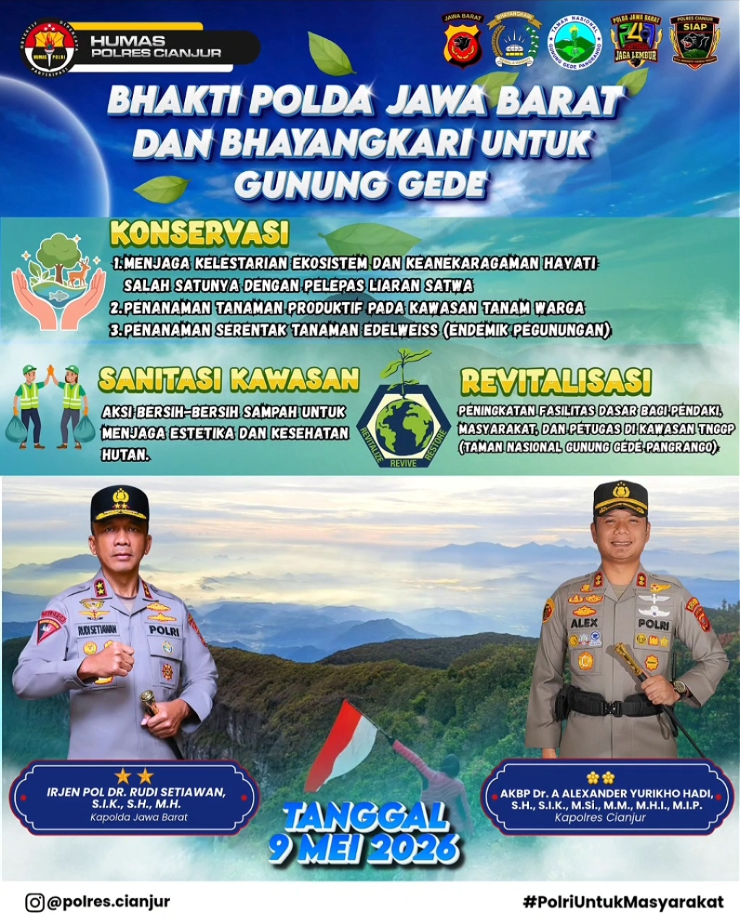CIANJUR– Polda Jawa Barat, Bhayangkari dan Polres Cianjur menggelar kegiatan “Aksi satu langkah untuk alam seribu manfaat untuk negeri, Lestarikan Gunung Gede” pada 9 Mei 2026 mendatang.