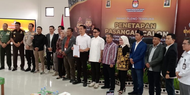 CIANJUR – Komisi Pemilihan Umum (KPU) Kabupaten Cianjur menetapkan pasangan Muhammad Wahyu Ferdian-Ramzy Geys Thebe sebagai Bupati dan Wakil Bupati Cianjur terpilih 2025-2030. Penetapannya dilakukan rapat pleno terbuka di kantor KPU Kabupaten Cianjur, Kamis, 6 Februari 2025.