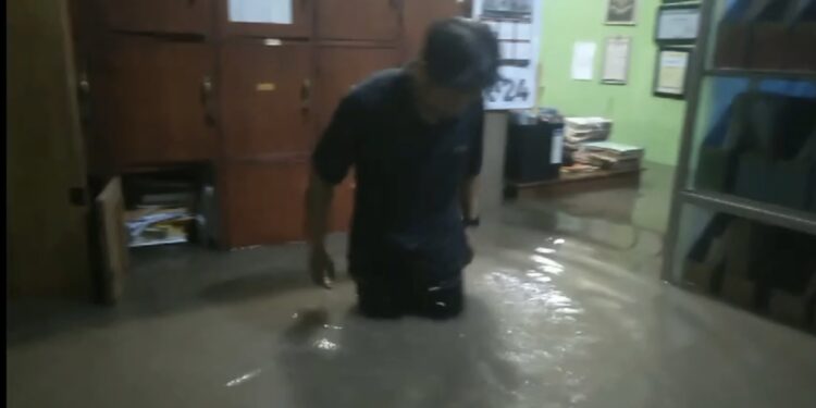 Tampak air memenuhi ruang kelas dan merendam meja dan kursi. Kedalaman air pun hingga pinggang orang dewasa.