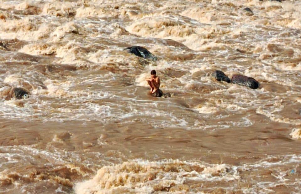 Ujib sempat terseret arus deras sungai. Tapi dia berhasil menyelamatkan diri ke atas sebuah batu yang berada di tengah aliran sungai.