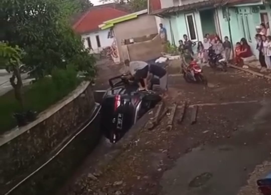 NYUNGSEP: Sebuah mobil teperosok ke dalam parit di Kampung Padaruum Desa Benjot Kecamatan Cugenang, Minggu, 20 April 2025. (Tangkapan layar/Video amatir)