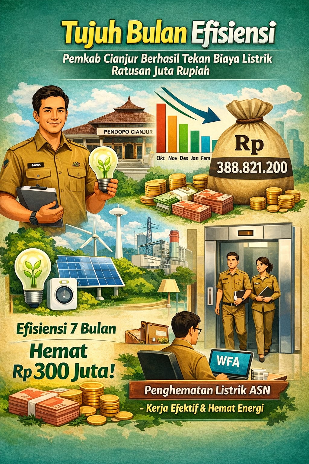Dalam waktu 7 bulan, Pemkab Cianjur berhasil menghemat biaya listrik senilai Rp388.821.200. Adapun pengeluaran listrik meningkat terjadi pada bulan Februari sebesar Rp49.600.951 dan pada Maret sebesar Rp41.858.432.