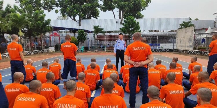 Terlihat petugas tengah memberikan arahan kepada para napi di lapang Lapas Kelas IIB Cianjur (Foto : Istimewa)