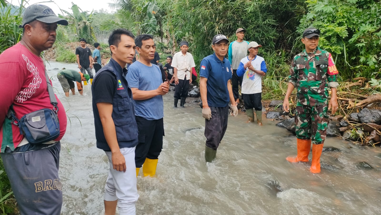 CIANJUR – Kegiatan gotong royong dilakukan warga Kampung Panojer Desa Mekargalih Kecamatan Cikalongkulon bersama PT AJBS, perusahaan peternakan ayam, serta Bhabinkamtibmas dan Bhabinsa setempat, Jumat, 29 November 2021. Kerja bakti dilakukan di kawasan sungai yang terdampak longsor akibat hujan deras beberapa hari lalu.